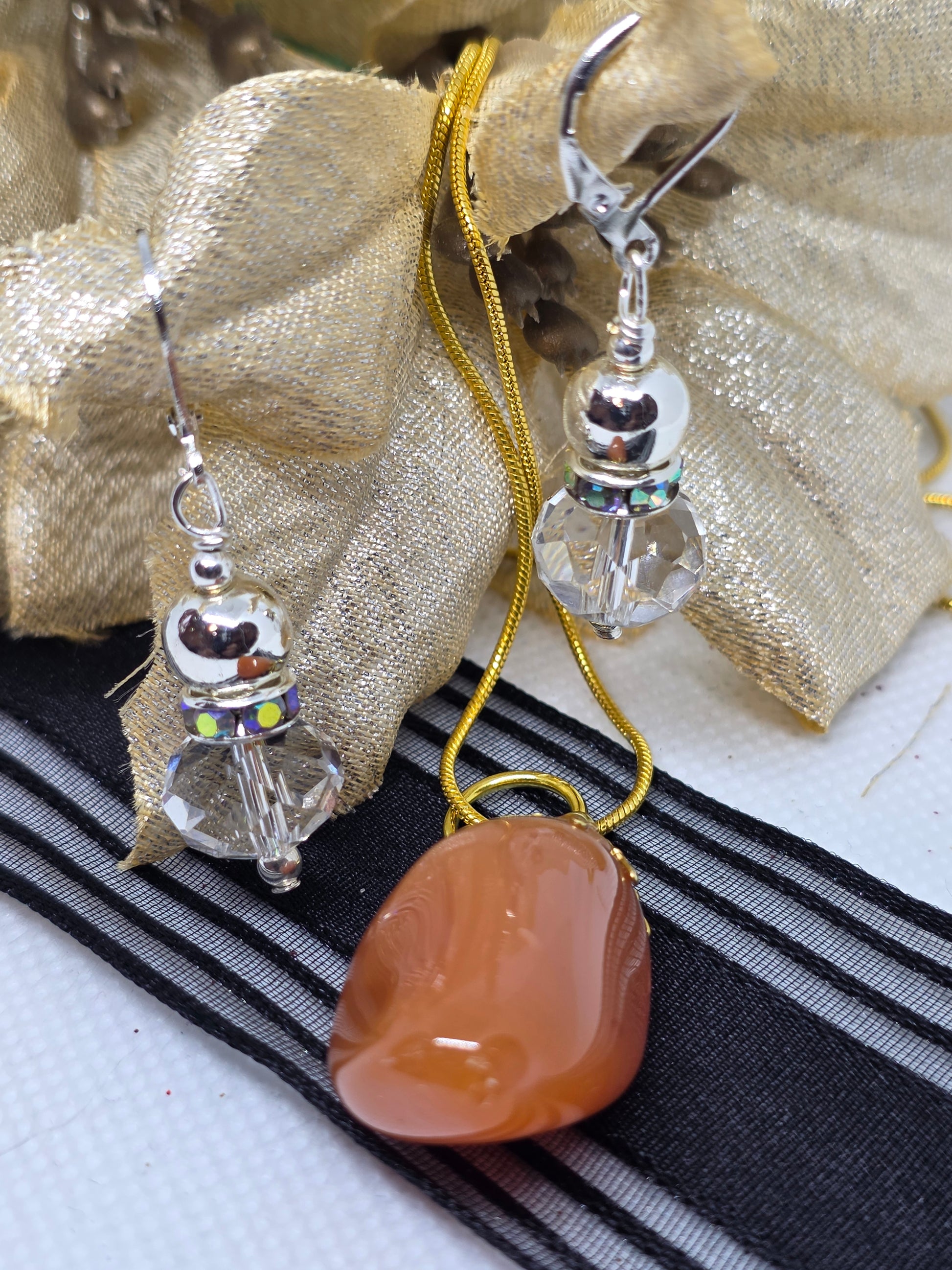 Add a touch of elegance with this charming jewelry set featuring a pink rock pendant necklace paired with delicate white earrings. Perfect for both casual and formal looks, the soft hues create a graceful and feminine vibe.
