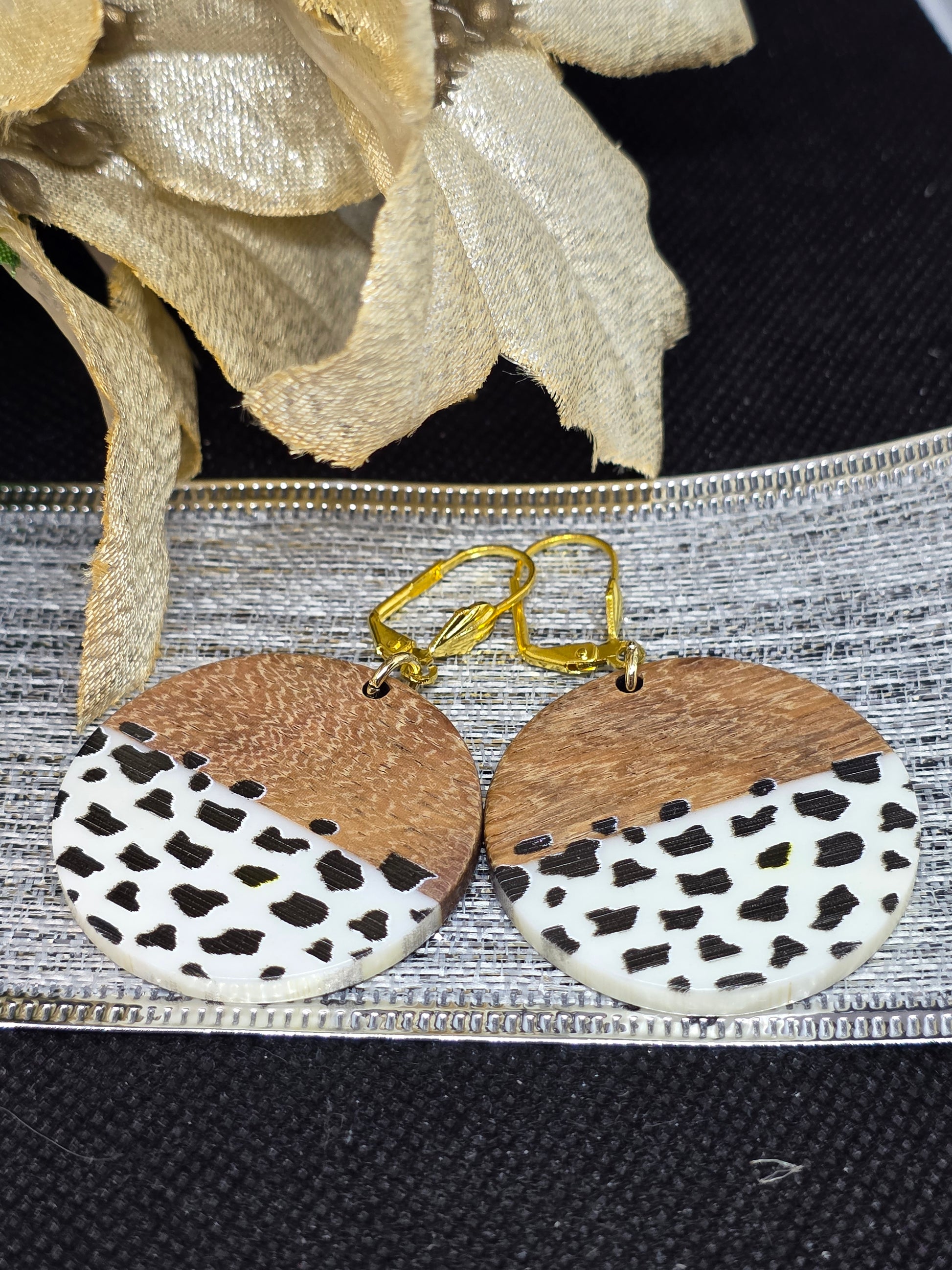 Unique earrings blending natural wood tones with bold Dalmatian spots—where earthy elegance meets playful pattern for a standout accessory.